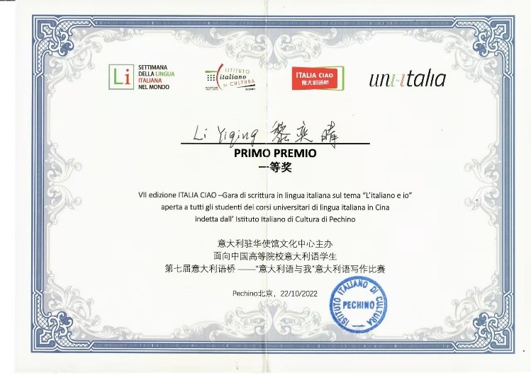 “ITALIA CIAO/意大利语桥”比赛由意大利驻华使馆文化处创办于2014年,是国内面向意大利语专业学生最重要的国家级比赛之一。比赛于每年10月的世界意大利语周期间举行,每年设定一个与意大利语周相关的主题。2022年的比赛首次采用写作形式,以L’italiano e io(意大利语与我)为题,吸引了来自全国21所高校的共计69名学生参与(其中本科组59名,硕士生组10名)。10月22日,于第二十二届世界意大利语周闭幕式之际,意大利驻华使馆文化处通过线上的方式举行了颁奖仪式。