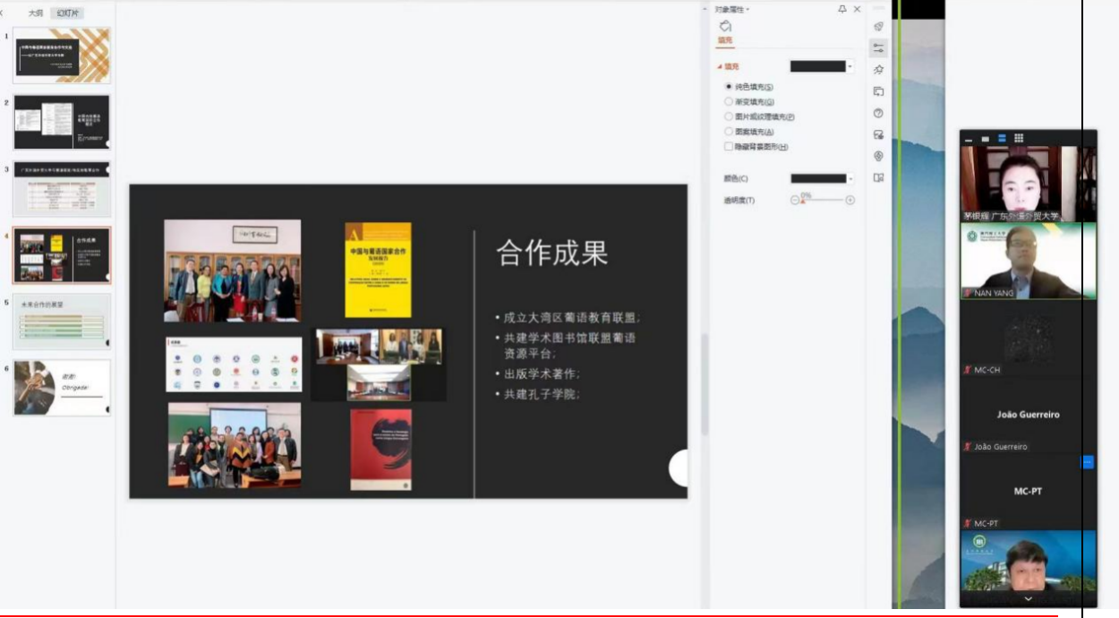为例,详尽介绍了我校与葡语国家及地区开展的包括学生交流、学者互访、科学研究、共建孔子学院、建设大学联盟等领域的交流与合作,提出在语言教育与信息技术发展密切相关的背景下,应扩大学生交流与合作、共建高校学者库、深化学术科研合作等一系列具体举措,加强中国与葡语国家的高等教育合作。茅银辉教授借此机会,向葡语国家及地区高校机构全面介绍并积极宣传了我校葡萄牙语专业发展及取得的初步成果。