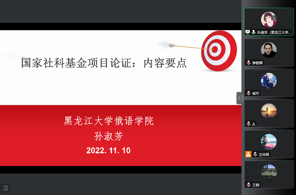 召开了2023年度高层次项目申报指导会,会议邀请了第八届国务院学科评议组成员、黑龙江大学孙淑芳教授针对国家社科项目申报作了题为“国家社科基金项目论证:内容要点”的指导。 近40位教师通过腾讯会议参与此次指导会,会议由茅银辉副院长主持。