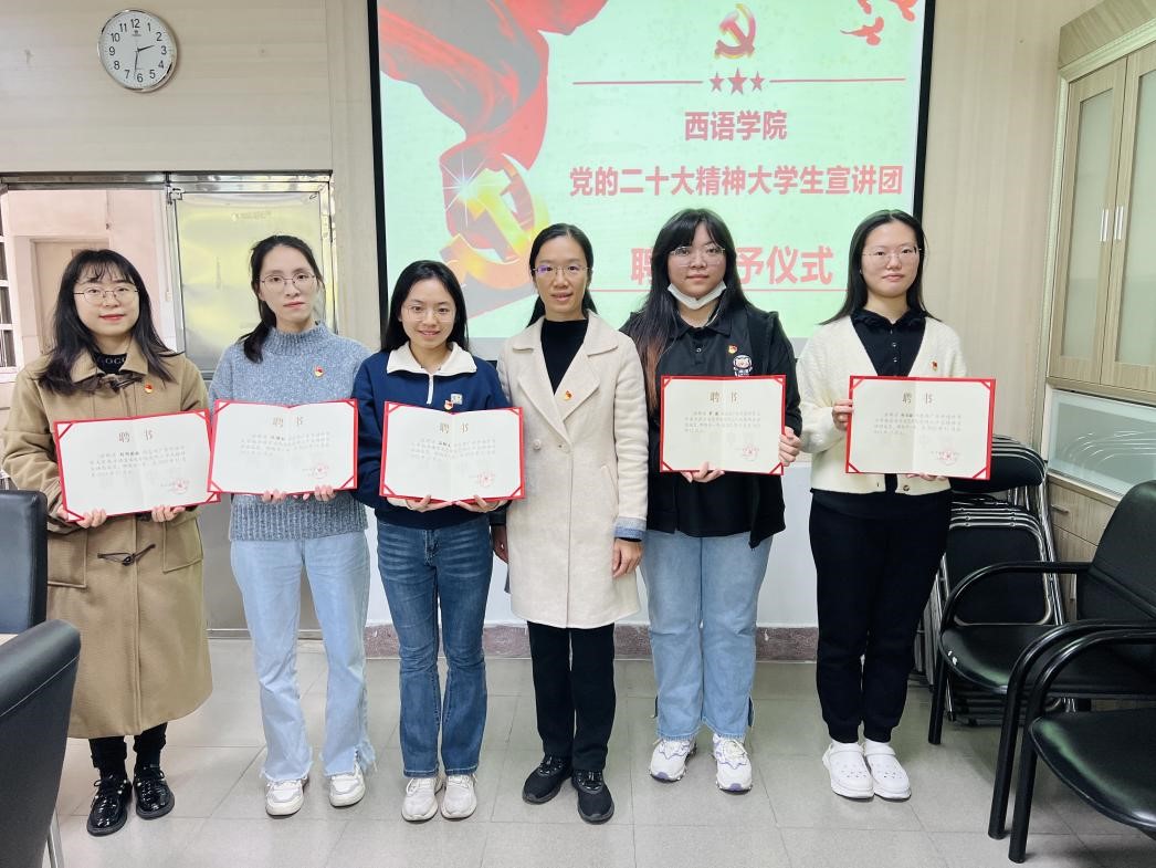 会上,学院副书记魏少娟还为学院党的二十大精神大学生宣讲团成员颁发聘书,鼓励宣讲团成员勇担责任,结合自身专业特长和身边的鲜活故事,开展形式多样的宣讲活动。
