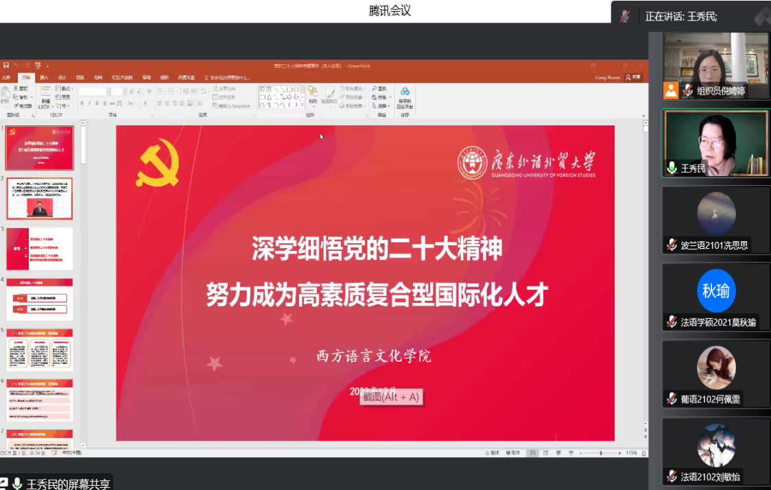 王秀民围绕深学党的二十大精神,细悟党的二十大报告内涵,贯彻落实党的二十大精神、推动学校各项事业高质量发展三方面,全面阐述党的二十大报告内涵,鼓励学生作为新时代外语学习者要贯彻落实党的二十大精神,堪当大任、胸怀天下,提高专业技能与人文素养,努力成为高素质复合型国际化人才。听完专题讲座,大家表示收获满满。
