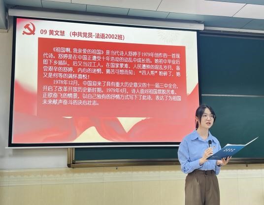 比赛中,来自7个学生党支部的12位党员深情诵读各类红色经典作品,如殷夫的《别了,哥哥》、李大钊的《青春》,梁启超的《少年中国说》、毛泽东的《浪淘沙·北戴河》、闻一多的《祈祷》、《陈觉给妻子赵云霄的信》等,通过朗朗诵读,或慷慨激昂,或真挚抒情,展现出西语学子对党的赤诚之心和对祖国的热爱之情。