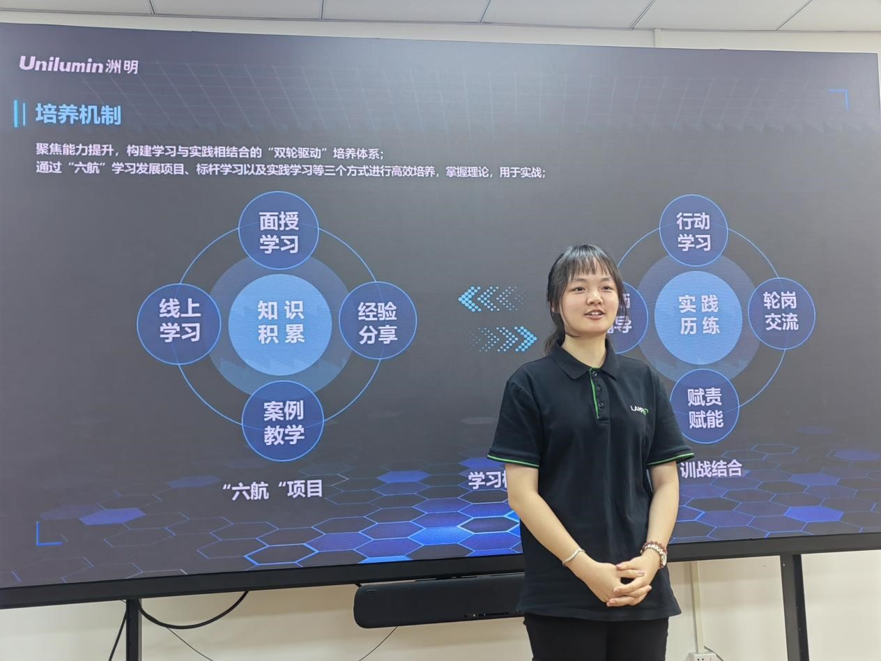 在座谈中,洲明人力资源经理王岩向师生们介绍了洲明的人才招聘计划、行业的趋势、企业的发展历程。王岩高度认可广外毕业的学生在洲明的工作表现和作出的贡献,认为广外和洲明在人才供需方面高度匹配。洲明员工代表、成人在线