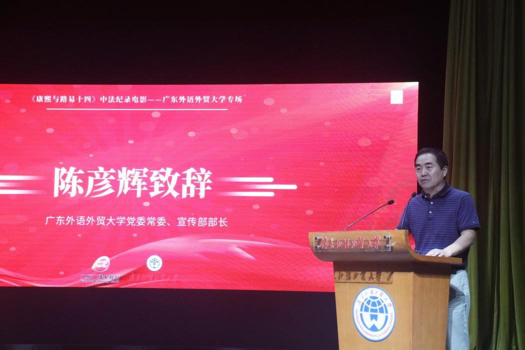 陈彦辉在致辞中对广州广播电视台和广州广电传媒集团有限公司、广州互动传媒有限公司的到来表示热烈欢迎,他表示优秀电影文化走进校园,对于拓宽文化交流融合、助力文化传播具有重要意义;广外始终致力于国际化人才培养,并在中法文化融合方面做出了许多积极的努力和贡献;他鼓励广外学子学好专业知识,用所学语言讲好中国故事,为推动中法两国文化交流和人文合作做出贡献。