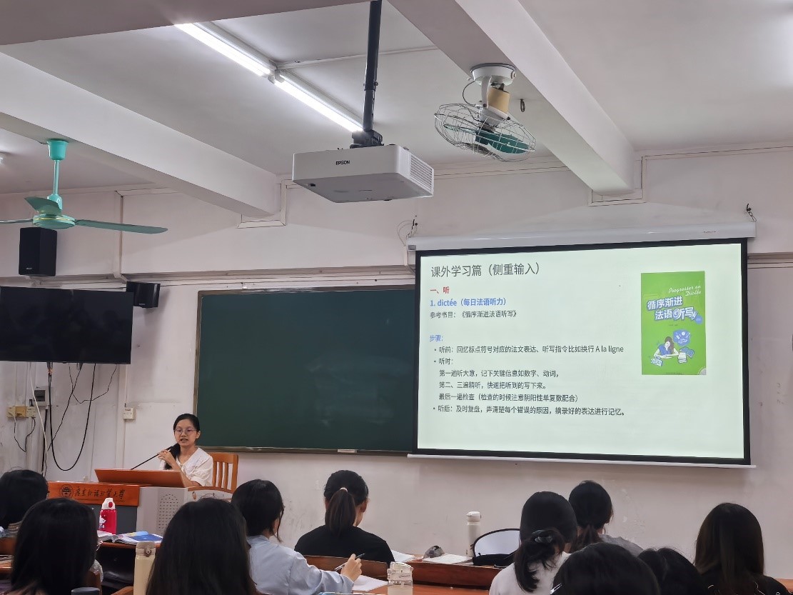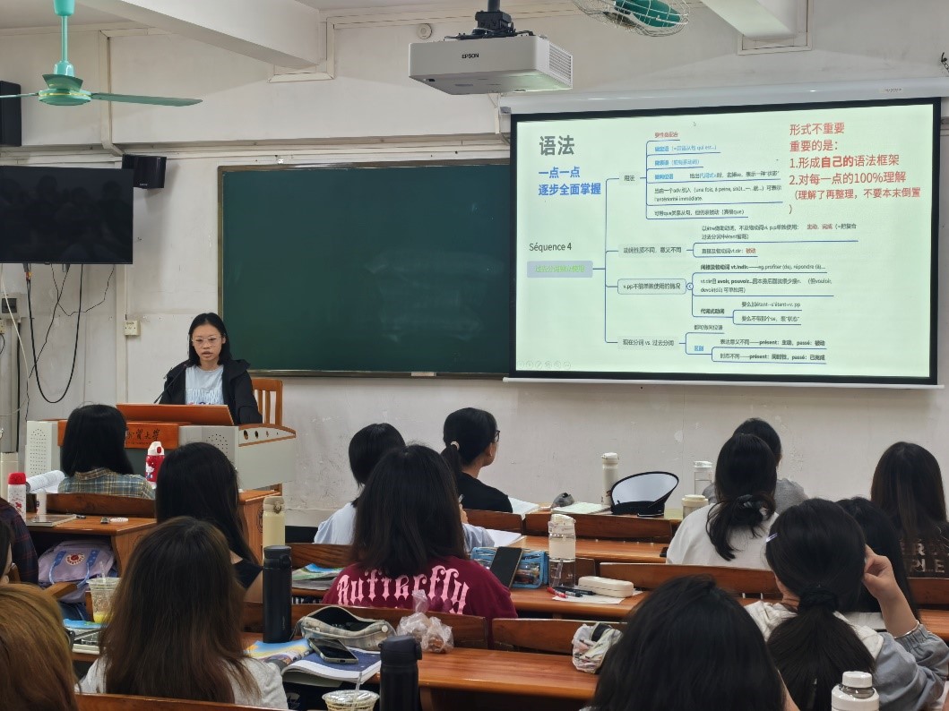 本网讯 11月14日上午,法语系举办了一场学习经验分享会,由2021级谢炜、游雅岚、刘飞等三位优秀学生向2023级学生传授法语学习心得。分享会内容丰富,涵盖了“课内学习”、“课外学习”、“专四备考”、“交换经验”及“升学经验”五大主题。