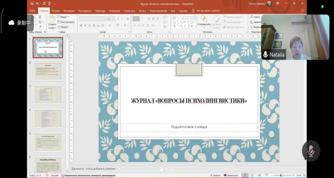 第二场讲座中,乌菲姆采娃教授首先讲述了研究历史最为悠久的莫斯科心理语言学派,并介绍了民族心理语言学的概念和相关的研究因素,指出语言对于产生民族世界观和意识共同性的必要性,以及“意识的内容总是由文化决定”,并以中国的汉语语言图景中的道德价值观为例加以解释。随后,乌菲姆采娃教授依次介绍了特维尔心理语言学派、彼尔姆心理语言学派和乌菲姆采娃心理语言学派,并展开描述了三个学派的研究内容。讲座最后,乌菲姆采娃教授深入讲解了圣彼得堡心理语言学派和沃罗涅日心理语言学派的相关研究,并列举了俄罗斯不同地区著名的心理语言学学者及其研究方向。本场讲座让大家对俄罗斯心理语言学各大学派有了进一步的了解。