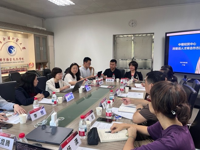 发展历程、办学现状、招生就业情况及“西语+”复合型人才培养模式。杨晓敏特别介绍了广外在西葡语人才培养方面的优势与成果,强调人才库建设对拓宽学生就业渠道、服务国家战略具有积极意义,尤其当前部分学生对职场认知不足,希望通过加强与企业对接,促进学生高质量就业。陈星介绍了学院教师参与社会服务的情况,指出学院师资在翻译技能与国别研究方面功底扎实,可为相关合作提供智力支持。魏少娟就学院实习基地建设情况作了说明,并期盼三方的合作能够为学生提供更多锻炼机会,促进理论与实际相结合。