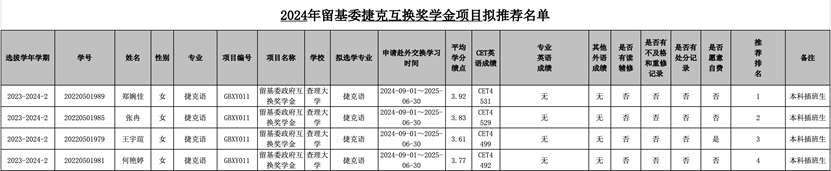 拟推荐4名本科插班生申请2024年留基委捷克互换奖学金项目,现予以公示。具体名单如下: