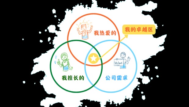 今天的同学们比之我们当年视野更加开阔,机会更加丰富,而身处信息爆炸的时代,方向感却也更加容易丢失,给大家一个建议,在多变的世界中抓住那个不变的本质。无论我们属于哪个世代,都会希望能做自己,更好地认知自己,了解自己的天赋、优势,探寻自己所热爱的领域(不知道自己喜欢什么的同学可以先用排除法先排除自己不喜欢的),在此基础上去寻找个人与企业需求间的交集,明确未来的发展方向。如图,这三环的交集就是“我的卓越区”。并且这三环的交集是动态进化的,不断探索并校准自己卓越区的过程也就是你成为更好的自己的美好经历。在此,祝每位师弟师妹都能找到并一直处于“我的卓越区”,成为更好的自己。