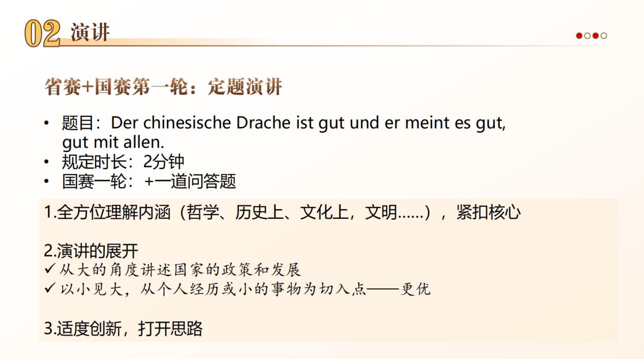 随后,练丰仪同学以她丰富的参赛经历,向大家展示了德语竞赛的多样性与魅力。作为2021级本科生,她曾荣获全国高校本科生德语配音大赛全国一等奖、第七届可持续发展全国青年德语风采大赛优胜奖等多项荣誉。她以系统性的方式,为大家梳理了如何高效获取德语赛事信息,并强调提前规划的重要性。